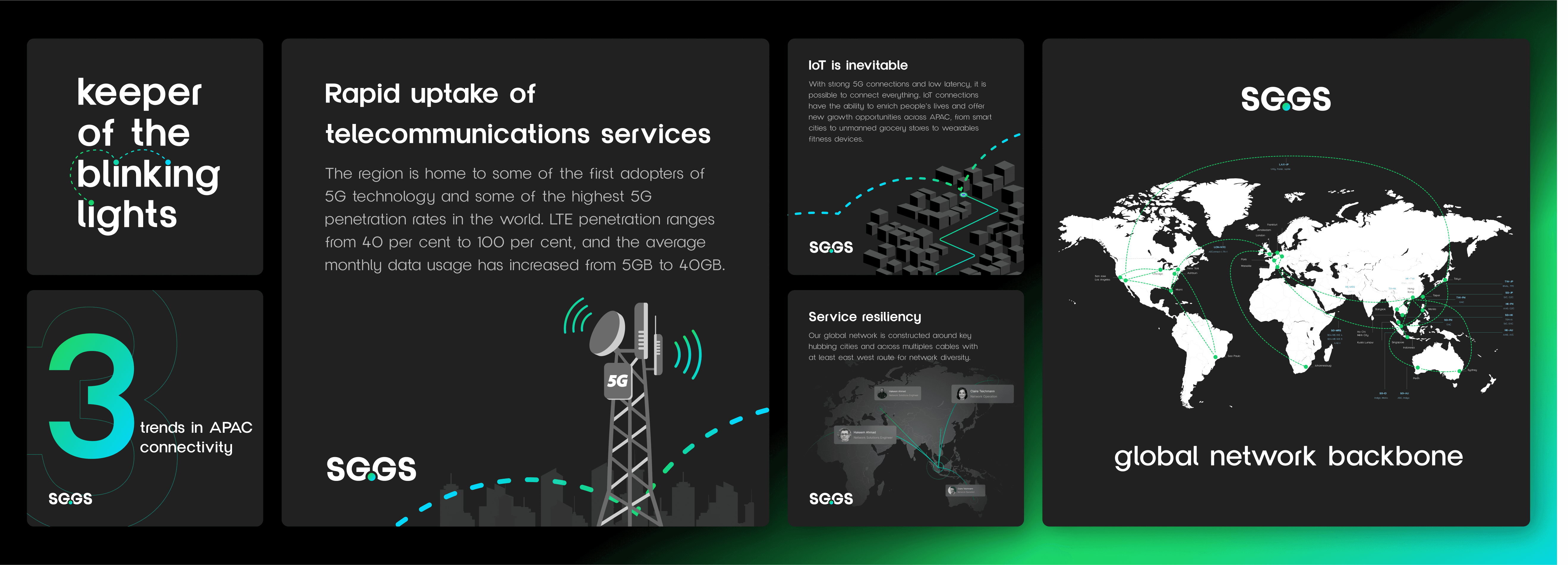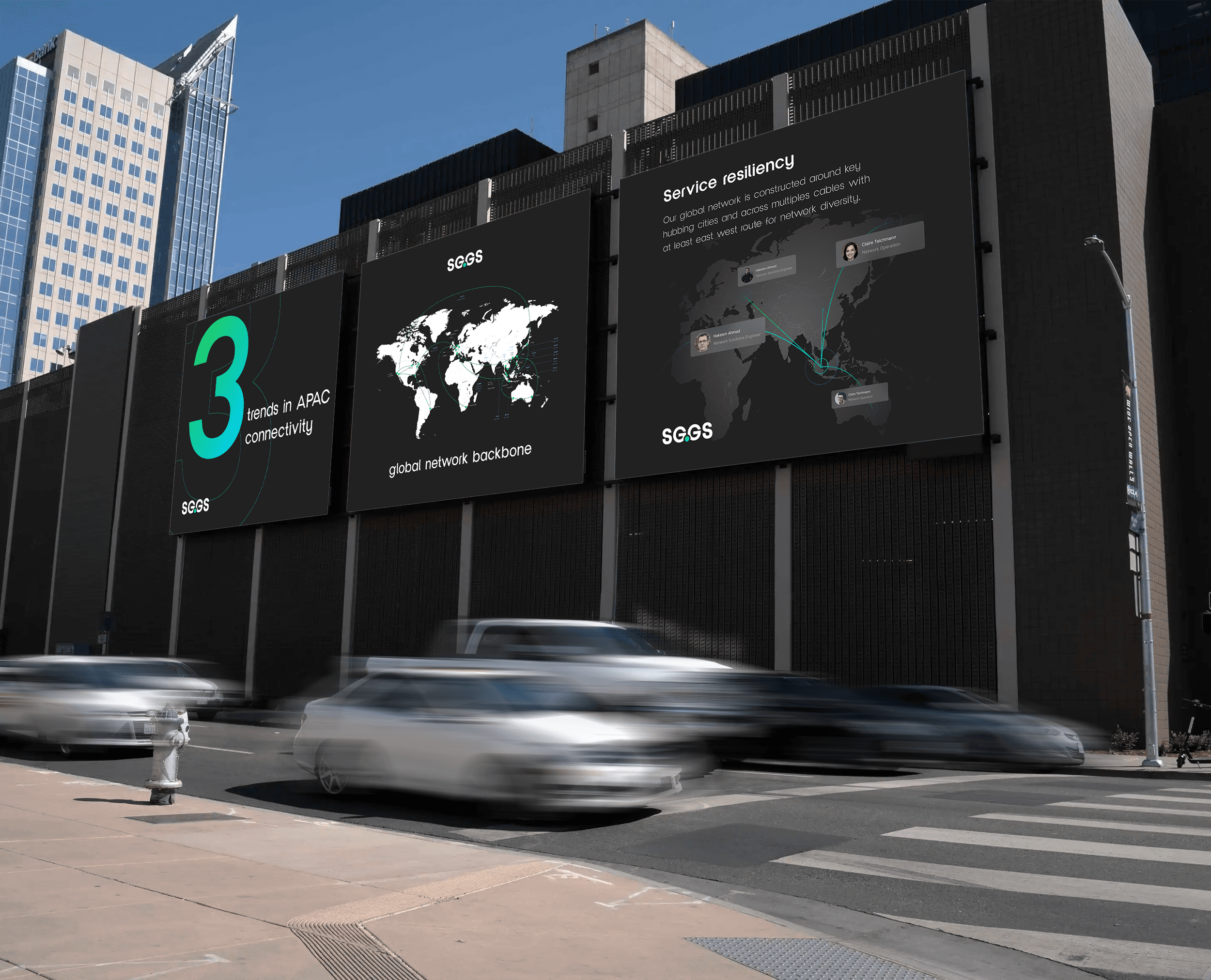I led a brand transformation that redefined SG.GS for global scale—visually, verbally, and digitally. Strategy & Messaging -Conducted market analysis across APAC, EMEA and North America -Positioned SG.GS against global network leaders -Developed a full messaging architecture tailored to enterprise buyers -Built clear product value propositions and internal playbooks Visual Identity -Refined the logo to keep brand equity while improving global legibility -Built a modern design system—technical but approachable -Created an image library and guidelines for cross-region consistency Digital Execution -Rebuilt the website with international audiences in mind -Restructured content for clearer product journeys and technical credibility -Designed sales and marketing collateral for localisation at scale -Aligned social media channels to the new global brand voice
